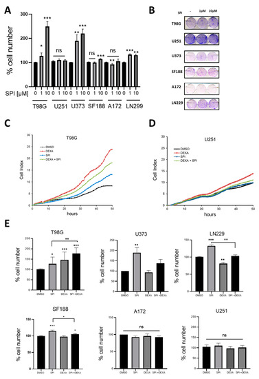 Next, we assessed the combination of SPI and DEXA treatment on GBM cells. As previously described [7] DEXA alone induced proliferation in T98G and U251 cells, but during the first 48 h of treatment the addition of SPI reduced this pro-proliferative effect of DEXA (Figure 5C,D). However, this inhibitory effect was not seen in long-term survival assays, whereby both DEXA and DEXA+SPI combination provided significant growth signals in T98G cells, but no significant effect was observed in U251 cells (Figure 5E). Furthermore, in U373, LN229, and SF188 cells, where DEXA had no pro-proliferative effect, SPI increased proliferation. No interaction between SPI and DEXA was observed in A172 and U251 cells (Figure 5E).