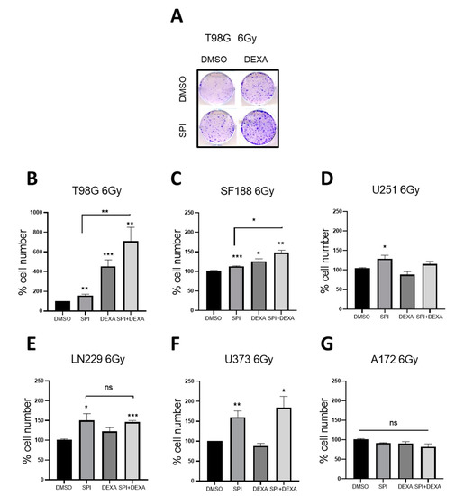 Effects of spironolactone in radiated cells. (A) Representative experiment of radiated T98G in the absence or presence of SPI 1 µM, DEXA 25 µM or both. (B–G) Cell number in the indicated cell lines radiated with 6 Gy and treated with SPI 1 µM, DEXA 25 µM or a combination of both. Data represent mean ± SEM (n ≥ 3). * p < 0.05, ** p < 0.01, *** p < 0.001.