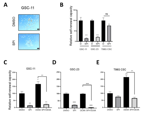 As we have observed previously [7], DEXA supported stem cell self-renewal in GSC-11, but interestingly not in GSC-23 cultures (Figure 7C,D). In CSC-T98G cells, DEXA stimulated neuro-sphere formation (Figure 7E). In the presence of SPI, self-renewal and neuro-sphere formation were blocked and overcame the stimulating effects of DEXA (Figure 7C,E).