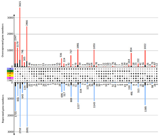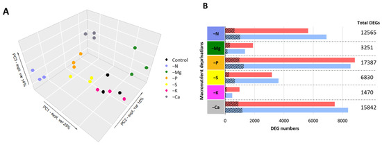 The count of total DEGs (up- and down- regulated compared to the control; p ≤ 0.05) for each macronutrient deprivation was highly variable (Figure 1B). Thus, P, Ca, and N deprivations affected the transcriptome the most with 17,387 (8839 upregulated and 8548 downregulated), 15,842 (7469 upregulated and 8373 downregulated), and 12,565 (5653 upregulated and 6912 downregulated) DEGs, respectively. For example, deprivation of S and Mg revealed about two- and fourfold fewer DEGs (6830 and 3251 DEGs, respectively) than N deprivation. Finally, K deprivation showed comparatively restricted effects on the transcriptome, with a total of only 1470 DEGs, of which 984 and 486 were up- and down- regulated, respectively (Figure 1B).