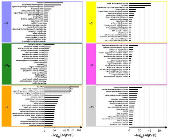 Looking at the genes that were common to n deprivations (2 < n < 6), the number of shared DEGs was dependent on the type of cluster being considered. For example, the N, P, and Ca macronutrient deprivation cluster shared 2308 (1081 up and 1227 down) DEGs, whereas the N, P, and K cluster only shared 18 (7 up and 11 down) DEGs, while only 15 DEGs (12 up and 3 down) were common to all six macronutrient deprivations. At a single deprivation level, 3282 (1547 up and 1735 down), 2011 (1170 up and 841 down), 6325 (3615 up and 2710 down), 1384 (741 up and 643 down), 439 (305 up and 134 down), and 5157 (2466 up and 2691 down) DEGs were specific to N, Mg, P, S, K, and Ca deprivation, respectively (Figure 4; Supplemental Data SD3). GO enrichment for “Biological Processes” was performed on sets of DEGs specific to each macronutrient deprivation (Supplemental Data SD4B). All enriched GO terms obtained for the N, Mg, S, and K deprivations (9, 18, 16, and 9, respectively) and a selection of the 20 most enriched GO terms for P and Ca deprivations are shown in Figure 5.
