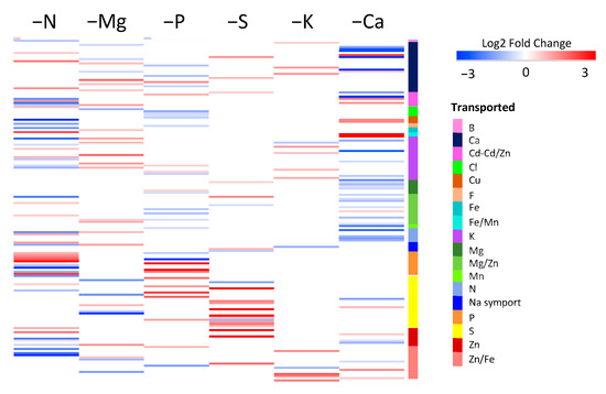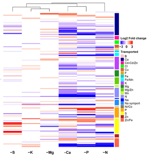 Log2 fold changes ratio of the 302 DEGs belonging to the “ion transport” group and clustered according to transported element. DEGs in roots of Brassica napus subjected to six individual macronutrient deprivations with significant (p < 0.05) upregulation (red) and downregulation (blue) compared to control plants.