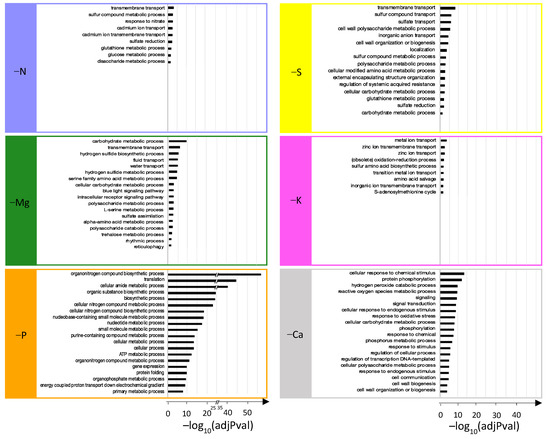 Top 20 significantly enriched “biological process” GO terms from specific DEGs of N, Mg, P, S, K, or Ca deprivations.