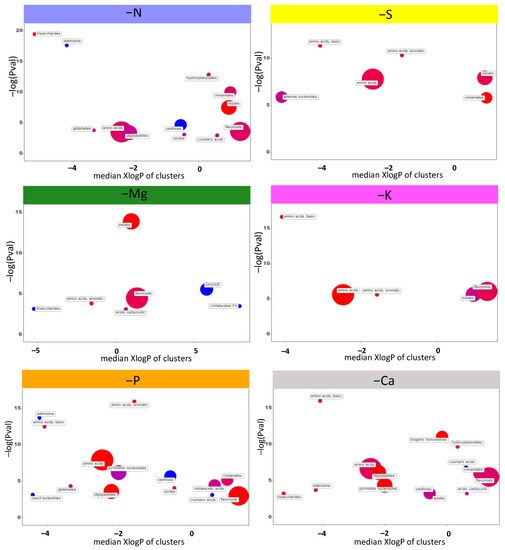 Chemical similarity clustering of the principal classes of metabolites performed by ChemRICH. Discs represent a significantly enriched family of modulated metabolites in Brassica napus roots subjected to six individual macronutrient deprivations. Enrichment −log(p-value) are displayed along the ordinate while the abscissa reflects the hydrophobicity (negative values) or hydrophilicity (positive values) of each group. Disc sizes varies with the total number of metabolites. Red, blue, and purple discs indicate groups with metabolites increased, decreased, and both increased and decreased, respectively.