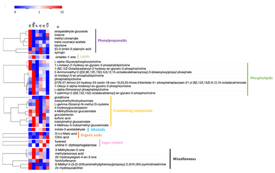 Hierarchical clustering of the 38 most discriminating metabolites (VIP > 4) significantly accumulated (red) and depleted (blue) relative to the control plants in Brassica napus roots subjected to six individual macronutrient deprivations. The colored dots indicate the biochemical classification of these metabolites.