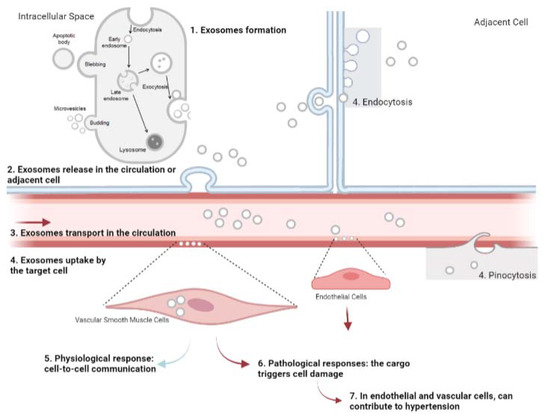 Figure 2. Exosomes mediate intercellular communication, contributing to hypertension. 1. Exosomes are formed by late endosomes in cells, budding into microvesicles; 2. exosomes are released by exocytosis into the circulation or in adjacent cells; 3. once exosomes are in the circulation, their cargo and affinity for the cell membrane will determine which cells are their target; 4. several types of cell, including immune cells, smooth muscle cells, and cancer cells, can uptake exosomes by different mechanisms, such as pinocytosis, phagocytosis, endocytosis, and internalization; 5. physiologically, the cargo of exosomes promotes cell-to-cell communication; 6. however, some contents of exosomes may trigger pathological responses, leading to diseases; 7. ultimately, in endothelial and vascular smooth muscle cells, the release of some miRNAs and other proteins from exosomes can cause endothelial/vascular dysfunction and contribute to the development of hypertension.