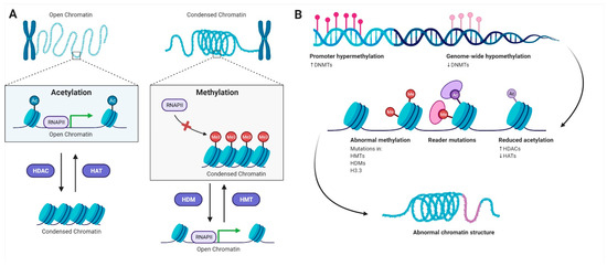 A number of histone modifiers and chromatin-bound proteins regulate transcription activation and repression. At the stable processes of the cell, an equilibrium between specific modifications and modifiers is sustained to retain chromatin structure, perform the precise gene expression program, and control the biological output (Figure 1). When the balance is changed, cell phenotypes can be altered, setting the stage for disease onset and progression [24]. Studying the main regulators of histone modifications will thus aid in the development of chemical probes to preserve homeostasis and regain the balanced state of the cell. Chromosomes are structured into coiled chromatin fibers, made up of units (nucleosomes), which are a central core of histone proteins, around which the DNA is coiled [25]. This condensed structure renders the DNA transcriptionally inactive via decreasing the interaction between the DNA and its transcription and replication proteins. Inversely, chromatin composition can be reversibly altered by uncoiling to grant access to DNA-binding factors and activate transcription. Histone acetylation is a major remodelling process, in which HATs introduce acetyl groups to lysine residues on histone N-terminal tails that protrude from the nucleosome complex [21]. Histone acetylation results in a loss of positive charge, decreased affinity between histones and DNA, and resultant uncoiling to give access to RNA polymerase and transcription factors. HDACs, on the other hand, eliminate acetyl groups and operate as a transcriptional suppressor [15].