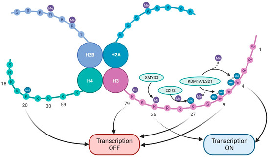 Two important enzyme groups control histone methylation: methyltransferases and demethylases. Histone methylation mainly involves the lysine (K) and arginine (R) residues on the N-terminal of the histone tail [31]. Histone methylation can promote or inhibit various gene transcriptions, denoting an intricate function in cancer, based on the location and methylation level of the target amino acid. Histone H3 has five lysines amenable for modification by methylation (K4, K9, K27, K36, and K79). Similarly, K20 of histone H4 undergoes methylation by a specific histone lysine methyltransferase. H3K4 and H3K36 methylation can activate gene transcription, whereas H3K9, H3K27, H3K79, and H4K20 methylation can suppress gene transcription [32]. Abnormalities in histone methylation are closely linked to various cancers.