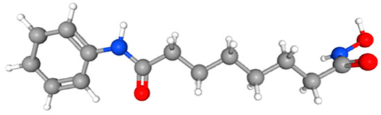 Vorinostat is a member of the hydroxamic acid group, which is the most diverse class of inhibitors with increased affinity for HDAC and has been shown to suppress both class I and II HDACs. At sub-micromolar concentrations, vorinostat prevents the enzymatic activity of HDAC1, HDAC2, and HDAC3 (class I) and HDAC6 (class II) [89]. Vorinostat (Figure 3) is a polar-planar compound of second generation that elicits cell arrest, differentiation, and/or apoptosis in a variety of transformed cells [90]. Vorinostat also demonstrated antiproliferative and pro-apoptotic effects in a variety of mouse xenografts and cancer cells, which include prostate, bladder, and breast carcinoma, as well as myeloma [91].
