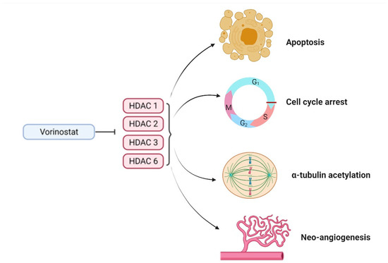 Vorinostat can also initiate G1/G2 cell-cycle arrest in a cell-dependent and dose-dependent manner, as well as disrupt vascular endothelial growth factor (VEGF) signalling, implying that vorinostat might also hinder tumour neovascularization (Figure 4) [93]. Numerous studies on the action of vorinostat in conjunction with cytotoxic agents targeting chromatin DNA (such as etoposide, camptothecin, cisplatin, doxorubicin, 5-fluorouracil, and cyclophosphamide) have revealed synergistic and additive function in a wide range of cultured human transformed cell lines [94]. The effect of p53 gene condition on the interaction of vorinostat and carboplatin (a DNA targeting agent) across several NSCLC cell lines has been researched. Vorinostat increased carboplatin-induced cytotoxicity in NSCLC cells with wild-type p53, but not in cells lacking p53, implying the interference of a p53-dependent pathway. As a result, the addition of vorinostat may facilitate a decrease in the conventional carboplatin dose while optimising the overall therapeutic index [95].