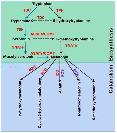 The melatonin metabolic pathway in plants contains two major parts: biosynthesis and catabolism (Figure 1). Melatonin was discovered and confirmed by an isotope tracer study of St. John’s wort (Hypericum perforatum L. cv. Anthos) seedlings [15,37]. It was found that melatonin is synthesized via four continual enzymatic reactions from tryptophan, requiring at least six enzymes: tryptophan decarboxylase (TDC), tryptophan hydroxylase (TPH), tryptamine 5-hydroxylase (T5H), N-acetylserotonin methyltransferase (ASMT), and serotonin N-acetyltransferase (SNAT) [17]. T5H-catalyzed hydroxylation of tryptamine is an important step of melatonin biosynthesis in rice (Oryza sativa) [38]. In animals, serotonin is initially acetylated to form N-acetylserotonin, and then O-methylated to form melatonin (named NM pathway) [39]. It has also been found that serotonin is O-methylated to form 5-methoxytryptamine, and then acetylated to form melatonin (named MN pathway) [39]. Both NM and MN pathways exist in plants [40].