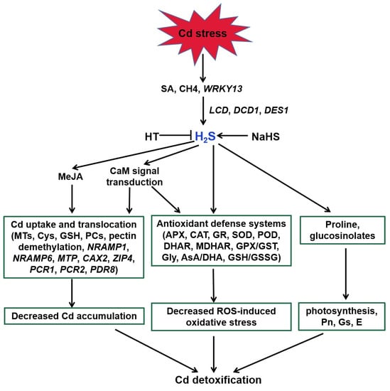 A number of studies address that H2S can interact with other signaling molecules, such as SA, proline, MeJA, Ca, and NO during the responses of plants to Cd stress (Figure 3 and Figure 4; [111,122,123]). H2S acted as a downstream molecule of SA-transmitted signals to regulate Cd tolerance in Arabidopsis [111]. The endogenous production of proline and MeJA enhanced by H2S donor NaHS responded significantly to Cd stress in foxtail millet [122,123]. H2S also improved CaM gene expression and controlled the combination of Ca2+ and CaM, which act as signal transducers [33].