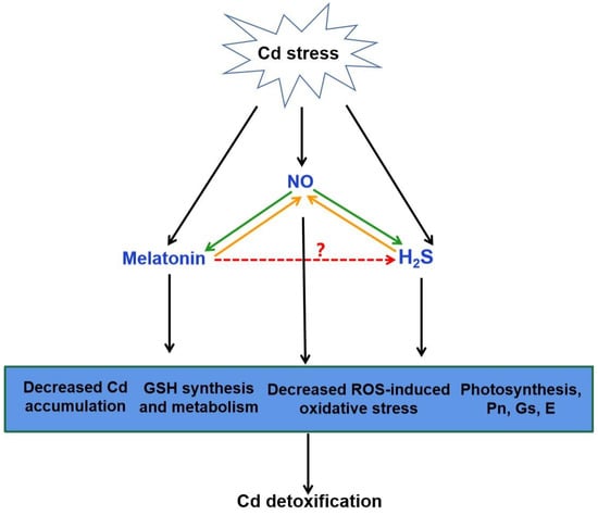 Currently, as a signal molecule, the role of NO has been revealed in melatonin-mediated Cd tolerance, likewise H2S plays a key messenger in plant resistance to Cd stress. That the effects of H2S have been less explored has prevented precise analysis of the collaboration of H2S and melatonin. Recently, we presented the underlying mechanisms of H2S action and its multifaceted roles in plant stress responses [137]. Hence, it would be interesting to fully evaluate the effects of H2S-based signaling on regulating melatonin-induced Cd tolerance. For directions of future research, biochemical and genetic characterization of H2S-producing proteins and persulfidation signaling is needed and will shed more light on the integration of H2S and melatonin signaling during Cd stress.