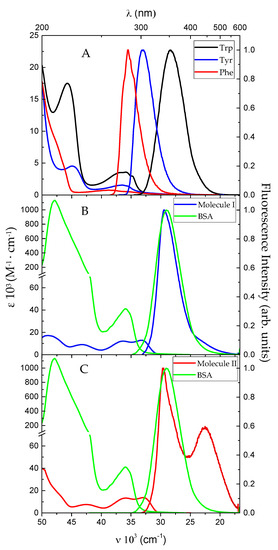 As mentioned earlier, UV−visible absorption and fluorescence spectroscopy belongs to the most important techniques used to explore small organic molecule−protein interactions. This is due to the fact that the spectroscopic properties of HSA and/or BSA (in fact protein’s fluorophores) are sensitive to the immediate neighbourhood i.e., polarity of their surroundings, as well as composition of the solvation shell. Thus, before undertaking the investigation of the interactions between BSA and two methyl benzoate derivatives (I and II), it is necessary to recall the spectroscopic behaviour of these two organic fluorophores, BSA, as well as three crucial amino acid residues: tryptophan (Trp), tyrosine (Tyr), and phenylalanine (Phe) (because, as mentioned, spectroscopic properties of the BSA are mainly governed by the absorption/fluorescence of above mentioned residues) [38].