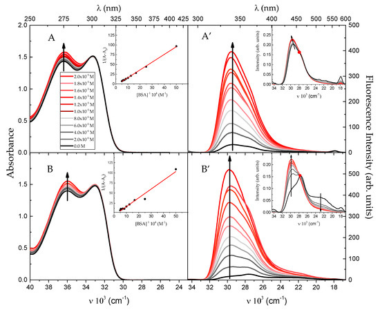 Absorption and fluorescence spectra (λexc. = 300 nm) of I (A,A’), II (B,B’) (c = 5 × 10−5 M) in phosphate buffer solutions containing different concentration of BSA (0 M, 2.0 × 10−6 M, 4.0 × 10−6 M, 6.0 × 10−6 M, 8.0 × 10−6 M, 1.0 × 10−5 M, 1.2 × 10−5 M, 1.4 × 10−5 M, 1.6 × 10−5 M, 1.8 × 10−5 M, 2.0 × 10−5 M). Insert the ground-state Benesi–Hildebrand dependence for I (A), II (B) and the normalized fluorescence spectra of I (A’) and II (B’) in phosphate buffer solutions containing different concentration of BSA.