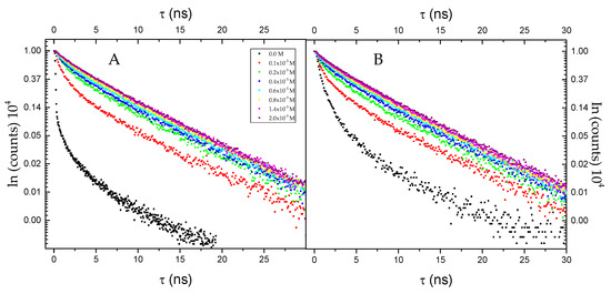 Fluorescence decay profiles of I (A) and II (B) in absence and different concentration of BSA (0.0 M, 0.1 × 10−5 M, 0.2 × 10−5 M, 0.4 × 10−5 M, 0.6 × 10−5 M, 0.8 × 10−5 M, 1.4 × 10−5 M, 2.0 × 10−5 M).