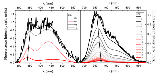 - Fee, R.S.; Maroncelli, M. Estimating the time-zero spectrum in time-resolved emission measurements of solvation dynamics. Chem. Phys. 1994, 184, 235–247. [Google Scholar] [CrossRef]