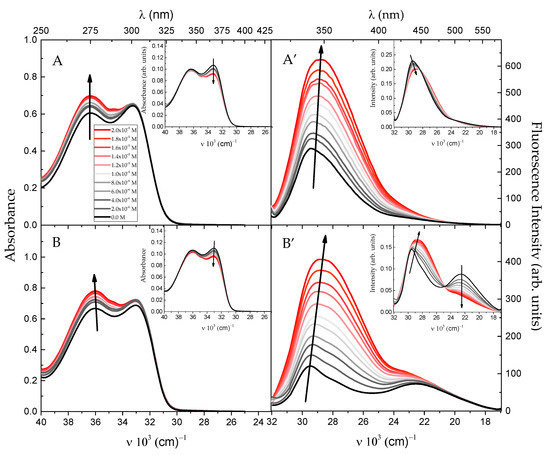 The long-wavelength absorption and fluorescence spectra (λexc. = 300 nm) of I (A,A’) and II (B,B’) (c = 5 × 10−5 M) in phosphate buffer solutions containing different concentration of Trp (0 M, 2.0 × 10−6 M, 4.0 × 10−6 M, 6.0 × 10−6 M, 8.0 × 10−6 M, 1.0 × 10−5 M, 1.2 × 10−5 M, 1.4 × 10−5 M, 1.6 × 10−5 M, 1.8 × 10−5 M, 2.0 × 10−5 M). In order to better visualize the changes in the absorption (in the long-wavelength (LW) region) and emission spectra, the normalized spectra (by scaling the area under the spectrum to be equal to unity) are presented in insert.