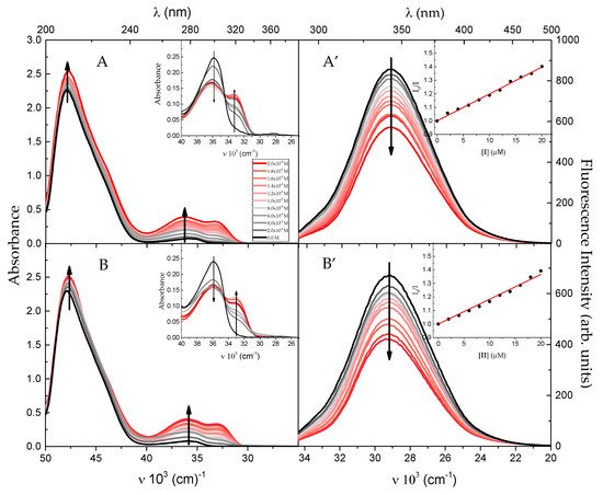 In order to clarify the interaction process between two methyl benzoate derivatives and BSA and Trp, we have also carried out a series of the steady-state absorption and fluorescence studies of BSA and Trp in the presence of I and II. To begin with, Figure 7 and Figure S3 show the changes observed in the absorption (A,B) and emission (A’,B’) spectra of BSA (Figure 7) and Trp (Figure S3) in the phosphate buffer upon the gradual addition of I (A,A’) and II (B,B’). In order to better visualize the changes in the absorption spectra in the long-wavelength (LW) region (250–340 nm), the normalized LW absorption bands (by scaling the area under the spectrum to be equal to unity) are presented in insert of Figure 7 and Figure S3. For both investigated systems (BSA-investigated molecules and Trp-investigated molecules), upon the gradual addition of the methyl benzoate derivative to the aqueous buffer solution of BSA (or Trp), the absorbance of the short-wavelength (centred at about 210 nm (BSA-I and BSA-II) and 218 nm (Trp-I and Trp-II)) and long-wavelength (centred at about 280 nm (BSA-I and BSA-II) and 275 nm (Trp-I and Trp-II)) bands gradually increases and simultaneously a new absorption band centred at around 310 nm appears. An isosbestic point in normalized LW absorption bands can be clearly seen between these two bands (see insert of Figure 7 and Figure S3), which confirms formation of the ground-state complex between BSA or Trp and both investigated dyes.