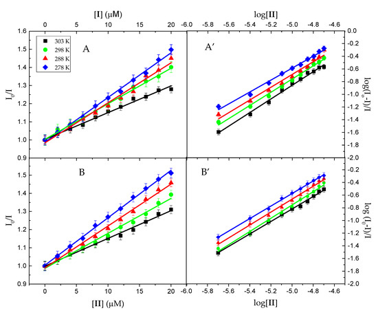 Stern-Volmer (A,B) and log(I0-I)/I versus log(molecule) (A’,B’) plots for quenching of BSA by I (A,A’) and II (B,B’) at different temperatures.
