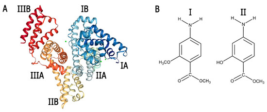 Structure of bovine serum albumin (BSA) (A) and methyl benzoate derivatives (methyl o-methoxy p-methylaminobenzoate–I, methyl o-hydroxy p-methylaminobenzoate–II) (B).