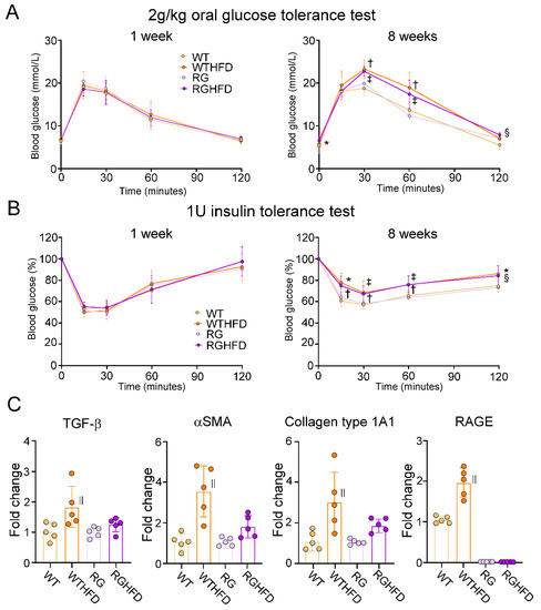 Effects of HFD on activation of PSCs isolated from WT and RG. Oral glucose tolerance test revealed that glucose tolerance was similar among all groups at the beginning of each week 1 (A). Eight weeks after HFD feeding, glucose tolerance was significantly aggravated in both WT and RG compared to those fed a normal diet. An insulin tolerance test revealed that insulin tolerance was comparable among all groups at the starting points (B). HFD feeding significantly aggravated insulin tolerance compared to normal diet feeding in both WT and RG. HFD feeding significantly increased the mRNA expression of TGF−β, αSMA, Collagen 1A1 and RAGE in PSCs isolated from WT mice (C). In contrast, HFD feeding had no significant impacts on the expression of those genes in PSCs isolated from RG. RAGE expression was almost null in RG. Values are presented as means ± SD. WT: Wild type, WTHFD: High fat diet−fed WT, RG: RAGE−null mice, RGHFD: High fat diet−fed RG. * p < 0.05 RG compared with RGHFD, † p < 0.01 WT compared with WTHFD, ‡ p < 0.01 RG compared with RGHFD, § p < 0.05 WT compared with WTHFD, || p < 0.05 compared with WT.