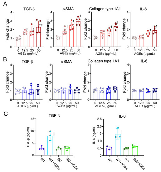 To evaluate the direct effects of AGEs on the activation of PSCs, PSCs isolated from WT and RG were stimulated with various doses of AGEs. AGE stimulation increased the mRNA expression of TGF−β, αSMA, collagen type 1A1 and IL−6 in WT PSCs in a dose-dependent manner, between 12.5 µg/mL and 50 µg/mL in PSCs isolated from WT PSCs (Figure 2A). In contrast, the effects of AGEs were eradicated on PSCs isolated from RG (Figure 2B). The concentrations of TGF−β and IL−6 were significantly increased in the supernatant of PSCs isolated from WT stimulated with 50 µg/mL AGEs (Figure 2C). On the other hand, AGEs stimulation had no impacts on the concentration in the supernatant of RG.