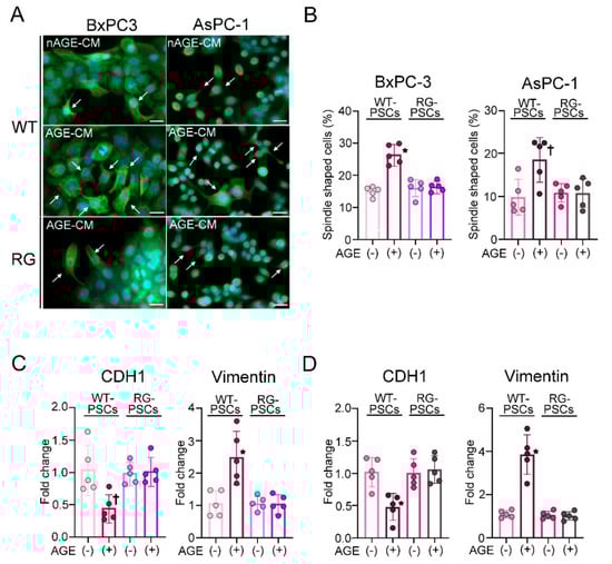 The human PDAC cell lines BxPC−3 and AsPC−1, cultured with conditioned media derived from the culture supernatant of AGE−stimulated PSCs (AGE−CM) or non-stimulated PSCs (nAGE−CM) for 24 h, transformed into spindle shapes similar to mesenchymal cells, as depicted by immunofluorescence for cytokeratin AE1/AE3 (Figure 3A). The frequency of transformed cells was 1.7 times and 1.9 times increased in AGE−CM compared to nAGE−CM (Figure 3B). The mRNA expression of CDH−1 was reduced by almost half and that of vimentin was 2.5 times elevated in BxPC−3 cells cultured with AGE−CM compared to nAGE−CM (Figure 3C). Coculture with AGE−CM similarly decreased the mRNA expression of CDH−1 and 3.9 times increased that of vimentin in AsPC−1 cells compared to coculture with nAGE−CM (Figure 3D). The induction of EMT was cancelled if BxPC−3 and AsPC−1 cells were cultured with AGE−CM derived from the culture supernatant of RG PSCs (Figure 3A–D).