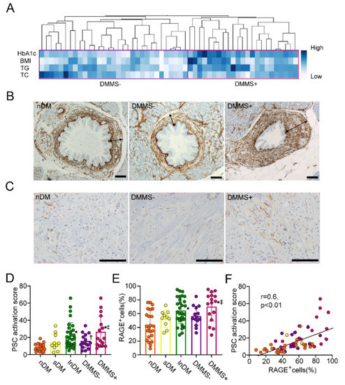 Surgically resected PDAC subjects divided into lnDM (more than 3-year duration of T2D), sDM (3 years or less duration of T2D) and non−T2D complicated PDAC subjects (nDM) were examined (Table 2). Average age, sex, and BMI were comparable between the nDM and lnDM groups. HbA1c was significantly increased in lnDM compared to nDM. lnDM showed a higher prevalence of worsened histological grade (poorly differentiated adenocarcinoma:por) and T stage than nDM (p < 0.01 and p < 0.05, respectively). N factors based on UICC, 8th edition, and classification were comparable between nDM and lnDM. sDM did not worsen any clinicopathological measures compared to nDM except for HbA1c. sDM showed a lower prevalence of worsened histological grade (por) and T stage than lnDM (p < 0.01 and p < 0.05, respectively). To examine the implications of the factors related to metabolic syndrome, HbA1c, BMI, triglyceride (TG), and total cholesterol (TC) in the activation of PSCs, hierarchical cluster analysis on the signature of these factors was conducted to see if there was a relationship to fibrosis in PDAC. There was a profile that yielded two distinct groups (DMMS− and DMMS+) (Figure 4A). The detailed clinical profile of DMMS+ patients is shown in Table 3. DMMS+ displayed high scores for all factors excluding HbA1c. Histologic grade and T stage were significantly worse in DMMS+ patients than in DMMS− patients (p < 0.01 and p < 0.05, respectively). When the mean value of αSMA expression surrounding pancreatic intraepithelial neoplasia (PanIN) as a PSC activation score was compared among the groups, the score was comparable between nDM and sDM (Figure 4B,D). There was a significant increase in the score in lnDM, DMMS− and DMMS+ patients compared with nDM patients (Figure 4B,D). DMMS+ showed a significant increase in the expression of αSMA surrounding PanIN compared with DMMS− (p < 0.05). The frequency of RAGE−positive stromal cells evaluated in the RAGE−immunostained sections was comparable in nDM and sDM (Figure 4C,E). The frequency mildly, but not significantly increased in DMMS− compared to nDM (Figure 4C,E). Those were further increased in DMMS+ and lnDM compared with in nDM. The frequency of DMMS+ was significantly increased compared to that of DMMS− (p < 0.05). The frequency of RAGE−positive stromal cells was significantly correlated with the degrees of αSMA expression surrounding PanIN (Figure 4F). These results could suggest that T2D with a duration of more than three years but not a short duration of diabetes had significant impacts on stromal activation concurrently with a high prevalence of RAGE−expressing stromal cells.
