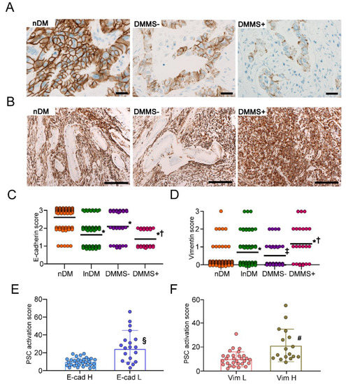 Immunohistochemical staining revealed the expression of E-cadherin on the cell membrane of PDAC cells, nonneoplastic ductal cells, islet cells and acinar cells (Figure 5A). The semiquantitative expression of E−cadherin in PDAC cells revealed that the expression was significantly reduced in lnDM, DMMS– and DMMS+ compared to nDM (p < 0.01) (Figure 5A,C). E−cadherin expression in PDAC cells of DMMS+ was significantly decreased compared to DMMS− (p < 0.05). In contrast, vimentin expression was mainly observed in the cytosol of stromal cells (Figure 5B). Vimentin expression in PDAC cells was significantly increased in lnDM compared to nDM (p < 0.01) (Figure 5B,D). The expression of lnDM was comparable with DMMS−. However, the expression in DMMS+ was significantly increased compared to that in DMMS− (p < 0.05). If E−cad H was defined as the cases showing an E−cadherin score of 3, the PSC activation score was significantly increased in E−cad L compared to E−cad H (p < 0.01) (Figure 5E). If Vim H was defined as the cases showing vimentin scores of 2 or 3 in PDAC, the PSC activation score was significantly increased in Vim H compared to Vim L (p < 0.01) (Figure 5F).