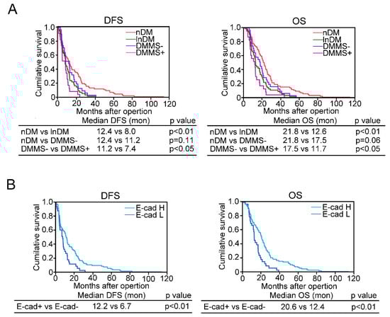 Prognosis of PDAC subjects complicated with T2D and metabolic syndrome. Kaplan−Meier survival curves showed a shortened DFS and OS in lnDM compared to nDM (A). OS of DMMS− were marginally shortened compared with those of nDM, while both for DMMS+ were much shorter than those of DMMS−. The reduction of E−cadherin expression in PDAC cells also shortened DFS and OS (B). nDM: nondiabetic subjects, lnDM: Long−term type 2 diabetic subjects, DMMS−: lnDM without metabolic syndrome, DMMS+: lnDM complicated with metabolic syndrome, E−cad H: E−cadherin highly expressed subjects, E−cad L: E−cadherin low expressed subjects.