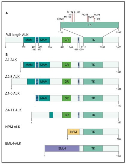 While the physiological role of ALK is not well understood, genomic variations in ALK have been known for over 20 years. Nearly 30 different ALK fusion proteins have been described, in which NPM–ALK and EML4–ALK are the most studied []. Morris and colleagues first discovered ALK in 1994 as a fusion protein with nucleophosmin (NPM) in anaplastic large cell lymphoma (ALCL) (Figure 1), which is a non-Hodgkin lymphoma []. EML4–ALK was described in 2007 in non-small cell lung cancer (NSCLC), where ALK is fused to echinoderm microtubule-associated protein-like 4 (EML4) [,]. ALK fusion proteins have also been described in diffuse large B-cell lymphoma, inflammatory myofibroblastic tumour, oesophageal squamous cell carcinoma, serous ovarian carcinoma, and breast and colon cancer [].