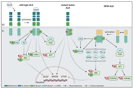 In addition, NPM–ALK has been shown to directly bind to insulin receptor substrate 1 (IRS1) [], SHC [], phospholipase C γ (PLC-γ) [], growth factor receptor-bound protein 2 (GRB2) [], and proto-oncogene tyrosine–protein kinase src (SRC). These proteins are involved in MAPK/ERK activation. In neural crest induction, the MAPK/ERK pathway is activated by the fibroblast growth factor receptor (FGFR) []. Interestingly, mutations in MAPK/ERK activation pathways are frequently observed in neuroblastoma relapse samples []. Finally, NPM–ALK has been shown to mediate the phosphorylation of signal transducer and activator of transcription 3 (STAT3). STAT3 is a transcription factor, which activates and regulates genes involved in proliferation, apoptosis, and differentiation [,]. In neuroblastoma cells, STAT3 has been found to directly bind to full-length ALK, which leads to STAT3 phosphorylation. Interestingly, inhibition of STAT3 leads to decreased growth and viability of neuroblastoma cell lines, in addition to decreased levels of MYCN in neuroblastoma cell lines carrying ALK mutations [].