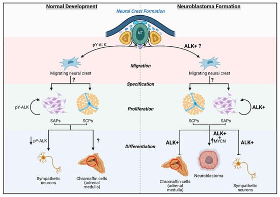 Regardless, neuroblastoma prognosis and aggressiveness are closely linked to the tumour differentiation state. We can postulate that an arrest in neural crest cell development results in undifferentiated stem-like cells, which lead to highly metastatic neuroblastoma (Figure 3). This malignant transformation could be promoting proliferation and migration, while blocking final differentiation of neural crest cells []. This is consistent with data from ALKF1174L knock-in mice, which display prolonged sympathetic neurogenesis with increased levels of the proliferation marker Ki67 []. In contrast, ALK knockdown leads to the reduction in proliferating immature sympathetic neurons, in addition to decreased sympathetic ganglia size [].