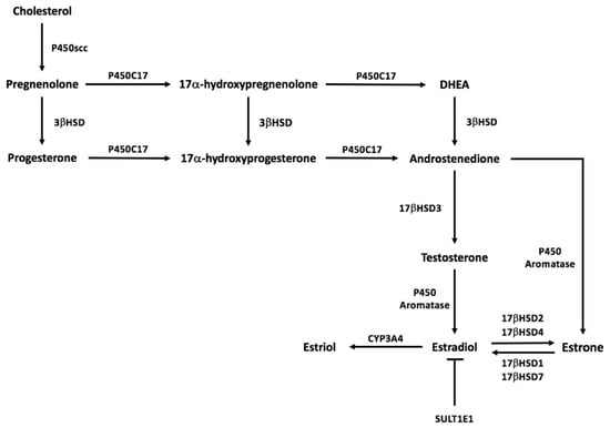 Downstream signaling of estrogen within adipose tissue via the estrogen receptor likely contributes to the pathophysiology of lipedema; however, this may not be an independent contributor. Dysregulation of estrogen synthesis may also contribute to the excessive accumulation of lower body adipose tissue. Estrogen synthesis predominantly occurs in female reproductive structures such as the ovaries, corpus luteum, and the placenta [19]. Although estradiol production is generally thought of as an endocrine product of the ovary, numerous other tissues have the capacity to synthesize estrogens from androgens and use estrogen in a paracrine or intracrine fashion. Indeed, adipose tissue (AT) is an organ characterized to produce estrogens and can contribute significantly to the circulating pool of estrogens [74,75,76,77]. There are three primary forms of estrogen: estrone (E1), estradiol (E2), and estriol (E3). Estradiol, the main product of estrogen synthesis, is the most potent form while estrone and estriol are weaker ligands [19]. Figure 1 outlines the general estrogen synthesis pathway including conversions between estrogen forms. All steroid synthesis pathways begin with cholesterol, the common precursor molecule, and are altered through successive enzymatic conversions. The first and rate-limiting enzymatic step of the steroidogenic process is the conversion of cholesterol into pregnenolone, which is subsequently converted to progesterone. P450C17 is needed to initiate androgen and estrogen synthesis [74]. P450c17 can mediate testosterone biosynthesis via the conversion of pregnenolone to dehydroepiandrosterone or via conversion of progesterone to androstenedione [78]. The final step in physiological synthesis of estradiol is aromatization of precursor testosterone by a CYP 19 gene product, cytochrome P450 estrogen aromatase. estradiol activity can be regulated by SULTE1E via sulfoconjugation leading to inactivation [19] or estradiol can be converted to the other estrogen forms. Estradiol and estrone can be interconverted with the action of 17β-hydroxysteroid dehydrogenases (17β-HSDs), whereas Estradiol can be hydroxylated into estriol via the enzyme Cytochrome P450 3A4 (CYP3A4). Overall, a dysregulation in adipose tissue sex steroid hormone production and paracrine signaling within the depot may contribute to the excessive accumulation of lower body adipose tissue characterized in lipedema.