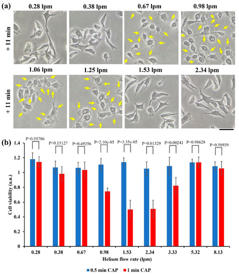 The flow rate of noble gas such as helium is an important operational parameter to modulate both chemical and physical properties in CAP. A higher flow rate tends to generate more reactive species, particularly, long-lived reactive species such as H2O2 [19,20,21]. In contrast, the impact of helium flow rate on the CAP’s EM effect shows a completely different trend. When helium flow rate increased from 0.28 lpm to 2.34 lpm, the cellular response (necrosis) did not show a simple proportional response. As shown in Figure 2a, the noticeable necrotic features occurred only when flow rate was at a middle range, from 0.67 lpm to 1.25 lpm. Neither too small nor too large flow rate would cause these necrotic cellular changes.