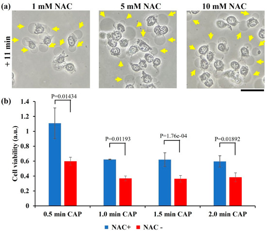 Rise of intracellular ROS is key cellular response to the chemically based CAP treatment, or more precisely, to the CAP-originated reactive species [22]. Pretreatment of intracellular oxidant scavenger such as N-acetylcysteine (NAC) can effectively inhibit the reactive species-induced cellular response, including an increase in ROS, DNA damage, mitochondrial damage, and cell death mainly apoptosis [23]. Here, the B16F10 cells were also pretreated by NAC-containing RPMI (1, 5, and 10 mM) for 60 min before the physically based CAP treatment on the bottom of an inverted dish.