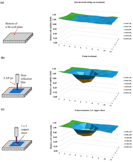 For the 96-well plate, because the EM effect in CAP would affect several surrounding wells, even the treatment was only performed on a single well, the final cell viability was presented in a 3D cell viability map. As shown in Figure 8c, the obtained cell viability values in all middle 10 × 6 wells were divided by the control group’s value. The obtained relative cell viabilities in all 10 × 6 wells were presented in a single 3D cell viability map.