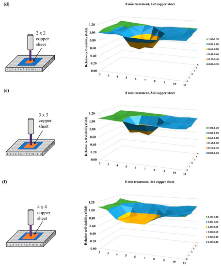 Just 8 min of the inverted setting of the 96-well plate without the coverage of bulk medium on cells would not cause growth inhibition on the B16F10 cells (Figure 4a). The heat-reflection sheet did not inhibit physically based killing effect on melanoma cells (Figure 4b). Here, we only focused on the role of EM effect on the physically triggered cell death. To block EM effect, an ideal conductive material such as metal is desirable. Four different sizes of square copper sheet (1 × 1, 2 × 2, 3 × 3, 4 × 4 well sizes) were purchased from McMasterCARR (9709k704). The thickness of copper sheet was 1 mm. N × N means a square copper sheet could cover N2 wells. For example, a 3 × 3 copper sheet could cover nine wells. The copper sheet was just above the heat-reflection film during a single treatment (Figure 4c–f). The copper sheet was centered at the well “6D”, as was the CAP jet. The 1 × 1 well copper sheet almost does not weaken the physically based killing effect. A weak inhibition was observed in the case using a 2 × 2 well copper sheet. When the size of copper sheet increased, stronger inhibition could be observed. When the size of copper sheet was adequately large, the physically based growth inhibition could be completely inhibited [17].