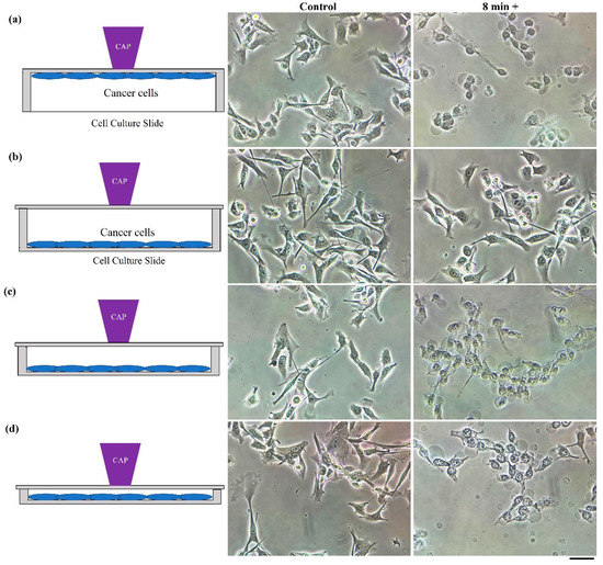 The gap between plasma and cells is a crucial factor for anti-melanoma effect. Schematic illustration and bright-field images of cells are shown in the left and right panels, respectively. “8+” meant photos were taken 8 min after treatment of 2 min. (a) Treatment on the bottom of an “upside-down” cell culture chamber slide (gap = 1 mm); (b) treatment on the lid of a cell culture chamber slide (gap = 13 mm); (c) treatment on the lid of a cell culture chamber slide (gap = 5 mm); (d) treatment on the lid of a cell culture chamber slide (gap = 2 mm). Experimental details were briefly illustrated here: The B16F10 cells were seeded (3 mL, 5 × 104 cells/mL) in a cell culture chamber slide for one day before treatment. Helium flow rate was 1.53 lpm. Immediately after treatment, a fresh medium (3 mL) was supplied to the culture chamber slide, followed by bright-field imaging. All photos were taken using a Nikon TS100 inverted phase-contrast microscope. Scale bar = 50 μm.