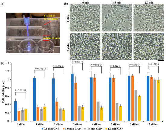 Penetration of EM effect through glass barriers: (a) A representative photo of treatment on glass slides above the bottom of a 12-well plate. A single slide had a thickness of 1 mm; (b) representative bright-field images (1 day after treatment) of the CAP-treated B16F10 cells. “0 slide” means treatment was performed directly on the bottom of the 12-well plate. “7 slides” means treatment was performed on seven glass slides above the bottom of the 12-well plate. Scale bar = 50 μm. Experimental details were briefly illustrated here: Following the protocols in Methods and Materials, the B16F10 cells (1 mL/well) were seeded (0.5 × 104 cells/mL) in a 12-well plate and cultured 24 h before treatment. Helium flow rate was 1.53 lpm. After treatment, 1 mL/well of fresh medium was immediately supplied in the 12-well plate, and cells were cultured three days before the MTT assay. (c) Physically based treatment could penetrate six glass slides to affect the B16F10 cells. Data were presented as the mean of three independent experiments. Statistical significance was calculated via one-way analysis of variance (ANOVA) followed by Bonferroni post hoc test for multiple comparisons.