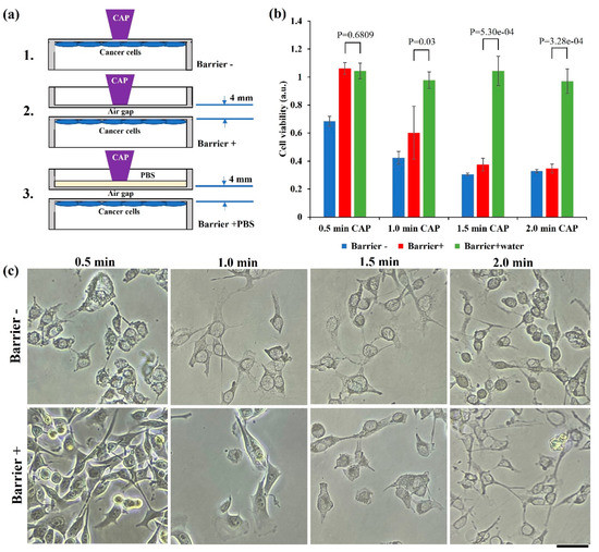 Water is a crucial factor to affect the biological effect of physically based CAP treatment, which may be due to the blockage of EM effect particularly at a mm wavelength range by water. For chemically based CAP treatment, water layer facilitates transformation and diffusion of short-lived reactive species in gas phase into long-lived reactive species in liquid phase [25]. We first demonstrated that a water layer could completely block the physically based killing effect using an “upside-down” setting. We compared the anti-melanoma effect in the following three designs (Figure 7a): (1) Treatment on bottom of 12-well plate. The bottom of plate was the only barrier. Therefore, the total barrier thickness between CAP and cells was 1 mm. (2) Treatment on a polystyrene lid, which was just above the bottom of plate, with an air gap of 2 mm. Because of the existence of lid and plate’s bottom, the total thickness of barrier was 4 mm. (3) Here, 20 mL (thickness 2 mm) of PBS (Gibco, 10010023) was added in the polystyrene lid.