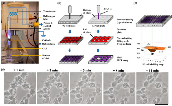The CAP jet source and physically based treatment: (a) The CAP jet source; (b) basic strategies to perform a physically based treatment on 96-well or 12-well plates; (c) 3D cell viability map. The 3D map presents all middle 10 × 6 wells’ relative cell viabilities in one figure. Five marked well numbers represent the boundary wells and the CAP-treated well “6D”. (d) A time-lapse imaging of a typical cellular change over the initial 11 min after a 2 min of treatment. Photos were taken at 1, 2, 5, 8, and 11 min after treatment, using a Nikon TS100 inverted phase-contrast microscope. Scale bar = 50 μm.