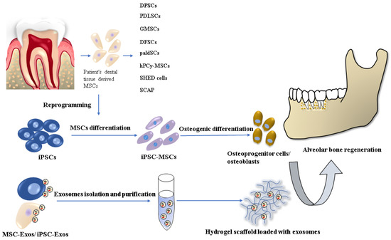 iPSCs represent a significant breakthrough in the field of regenerative medicine as well as a rising option for cell-based therapy in dentistry involving alveolar bone regeneration. iPSCs are derived from patient’s somatic cells preventing immune rejection and can differentiate into several different cell lineages. Thanks to the abovementioned advantages, iPSC technology may be implemented as an alternative to autologous grafting, by which the patient-specific somatic cells are reprogramed into MSCs/osteoprogenitor cells, and seeded on an appropriate scaffold, and treated with bioactive molecules [50]. It is assumed that, in the case of dental tissue regeneration, the generation of iPSCs from dental tissue may be more beneficial than other tissue sources because of probable epigenetic memory maintenance of the source tissue [9,51]. In comparison with dental tissue-derived stem cells, dental tissue-derived iPSCs are more proliferative in vitro and its regenerative ability can be more easily reproduced [52]. Numerous studies have reported the successful generation of iPSCs from various types of dental tissues, such as exfoliated deciduous teeth [53,54,55], extracted wisdom teeth [56], oral mucosa fibroblasts [57,58,59], gingival tissue [60,61,62,63,64], periodontal ligament [65], and the dental pulp [66,67,68].