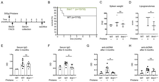 Experimental design, survival and autoimmunity parameters. (A) WT and Ifnlr1−/− mice were intraperitoneally injected with 500 µL of pristane and sacrificed after 6 months. Blood and serum were collected at 2 weeks and 3 and 6 months after pristane injection. (B) After injection with pristane, all Ifnlr1−/− mice survived until the 6-month time point, whereas 70% (n = 7/10) of WT mice died within the first month after injection. (C) Spleen weight at sacrifice. (D) Semi-quantitative scoring of lipogranulomas showed decreased lipogranuloma formation in Ifnlr1−/− mice (0 = none; 1 = low; 2 = moderate and 3 = high numbers of lipogranulomas per mouse. (E,F) Total IgG levels were determined by ELISA at 3 and 6 months after pristane treatment. (G,H) Anti-dsDNA-IgG levels were determined at 3 and 6 months after pristane treatment by ELISA. Each symbol represents an individual sample and all samples were included. Bars represent median with interquartile range. Statistical analyses to compare WT + pristane vs. Ifnlr1−/− + pristane were performed using Mann–Whitney U test. * = p < 0.05; ns = not significant. Values of WT without pristane are shown as reference. Findings were confirmed in at least one other independent experiment.