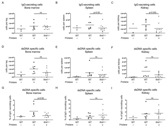 Deficient type III IFN signaling results in a trend towards reduced numbers of antibody-secreting cells in the spleen and kidneys of pristane-treated mice. Numbers of IgG-secreting cells in (A) bone marrow, (B) spleen and (C) kidneys and numbers of anti-dsDNA-IgG-secreting cells in (D) bone marrow, (E) spleen and (F) kidneys at 6 months after pristane treatment were determined by ELISPOT assay. (G–I) Percentage of anti-dsDNA-IgG-secreting cells of total IgG-secreting cells in indicated tissues. Each symbol represents an individual sample and all samples were included. Bars represent group mean. Statistical analyses to compare WT + pristane vs. Ifnlr1−/− + pristane were performed using Mann–Whitney U test; ns = not significant. Values of WT without pristane are shown as reference.
