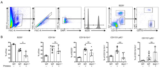 2.6. Ifnlr1−/− Mice Show an Increased Proportion of Peripheral CD115+Ly6C+ Monocytes at 2 Weeks after Pristane Treatment