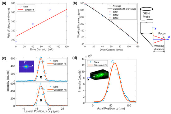 FOV of the microimaging system is demonstrated in Figure 2a,b. The FOV along the x and y directions is a function of the drive current of the ETL (or equivalently the working distance). The larger the drive current the larger the FOV, as demonstrated in Figure 2a. The linear fit function suggests a for x and y directions, where is the drive current of the ETL. The FOV varied between 310 µm and 368 µm when the drive current was changed from 0 to 120 mA which was used in all experiments. This changing lateral FOV leads to a 3D FOV having the shape of a tapered cube (see later in Figure 3b). Figure 2b illustrates that the larger the drive current the smaller the working distance (WD). WD is defined as the axial distance between the focal point and the prism output surface, as demonstrated on the right of Figure 2b. The quadratic fit function suggests , resulting in a z direction FOV of 285 µm for the drive current range of 0–120 mA.