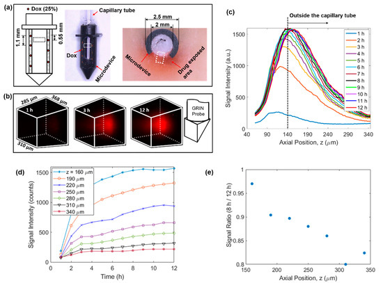 Using the above developed MI-MD system, local delivery of doxorubicin in freshly excised tissue phantom was evaluated. The setup included seven spatially separated reservoirs for drug release (four and three equally separated reservoirs on the left and right side of the opening, respectively), see the left panel of Figure 3a. The axial separation between adjacent reservoirs was 1.1 mm and the axial offset between the two columns was 0.55 mm. The center of the FOV was aligned with the top reservoir on the right side. One image of the drug loaded microdevice is shown in the middle panel of Figure 3a. One image of the sectioning after 12 h of implantation is also shown in the right panel of Figure 3a, where the dark red coloring of the tissue represents the area with drug exposure. Figure 3b displays the 3D images of the drug signal at the time points of 1 h, 3 h, and 12 h, which clearly visualizes the expansion of drug-exposed area over time. See Supplementary Video S1 for visualization of the whole diffusion process. Relative orientation between the 3D image and the GRIN probe is shown by the schematic on the right of Figure 3b. The temporal evolution of the on-axis drug diffusion is examined in Figure 3c, which suggests a rapid increase in overall signal intensity in the early implantation period, followed by a gradual plateau after about 8 h. To achieve the greatest possible optical penetration depth into the tissue, the GRIN probe was moved as close as possible to the capillary tube, and in this case the separation between the lens prism surface and inner capillary wall along the z axis was calculated to be around 130 µm. Note that the capillary tube wall thickness was 10 µm, thus it was outside the capillary tube for z positions larger than 140 µm, as indicated by the vertical dashed line in Figure 3c. To show explicitly the drug delivery dynamics reflected in Figure 3c, the signal intensity as a function of time at various z locations is displayed in Figure 3d. In addition, the signal ratio at 8 h to that at 12 h is plotted in Figure 3e. The data in Figure 3d,e indicate quantitatively: (1) the delivery process had completed over 80% after 8 h in comparison to the status at 12 h, and (2) the delivery took longer to reach equilibrium at locations farther away from the drug reservoir (i.e., positions with larger z values).