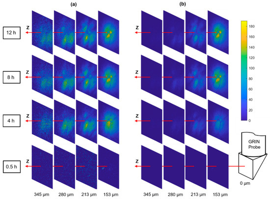 Tumors are known to be very heterogeneous tissues [28], therefore, the drug infiltration after systematic dosing may also be highly nonuniform which has been postulated as an important mechanism of patient drug resistance [6]. The MI-MD system is capable of optically sectioning the drug delivery process in situ, and thereby monitoring the drug penetration through different regions of a heterogeneous tumor. Figure 5a shows a series of distance slices through the optical sectioning for diffusion of the commonly used anti-cancer drug doxorubicin, where the slices use their own color bar to better visualize the microstructure. Figure 5 displays the same images with a common color bar, which allows for a direct comparison of drug signal intensity between slices. A distinct spatial pattern is clearly visualized when the signal levels are above a detection threshold, as shown by the slices at z = 153 µm for the time points of 4 h, 8 h, and 12 h. This pattern was stable over time, which indicates it was originating from the tumor tissue architecture itself rather than a possible nonuniform drug diffusion process.
